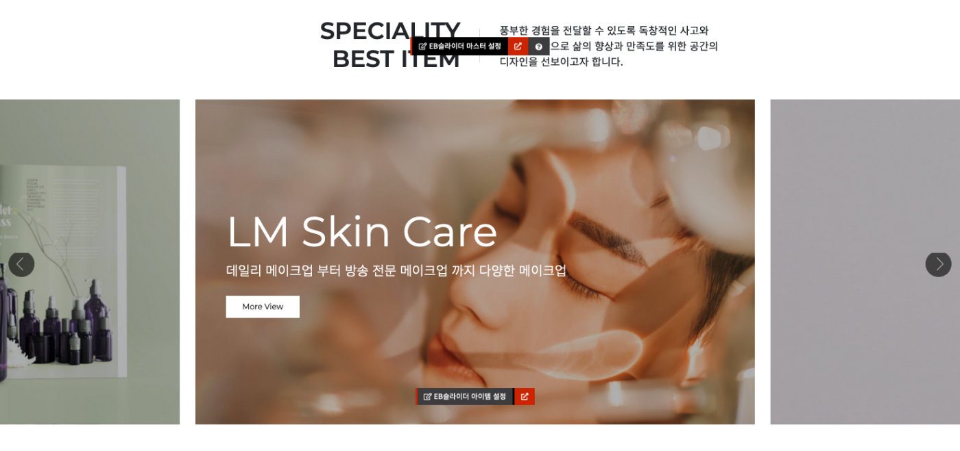 - · 푸터슬라이더(EB슬라이더) : 아이템설정 - 대표타이틀, [링크] #1 입력, 이미지 #1,2(이미지 비율 #1(pc) : 800x694 픽셀 / #2(mobile) : 800x230 이미지 사용)를 입력 및 등록